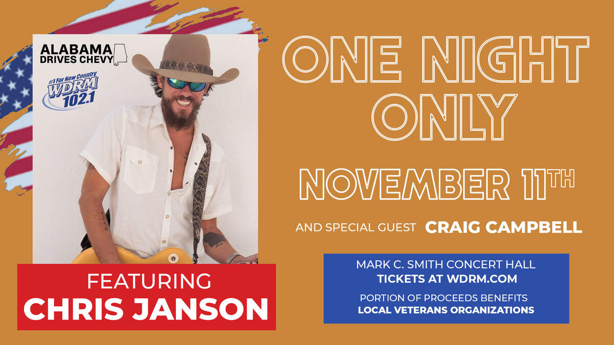 102.1 WDRM and the Tennessee Valley Chevy Dealers Association Present "One Night Only", a night to celebrate our soldiers on Veteran's Day. Performances by Chris Janson and special guest Craig Campbell!